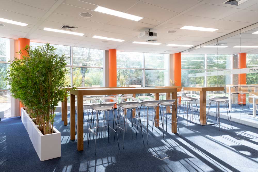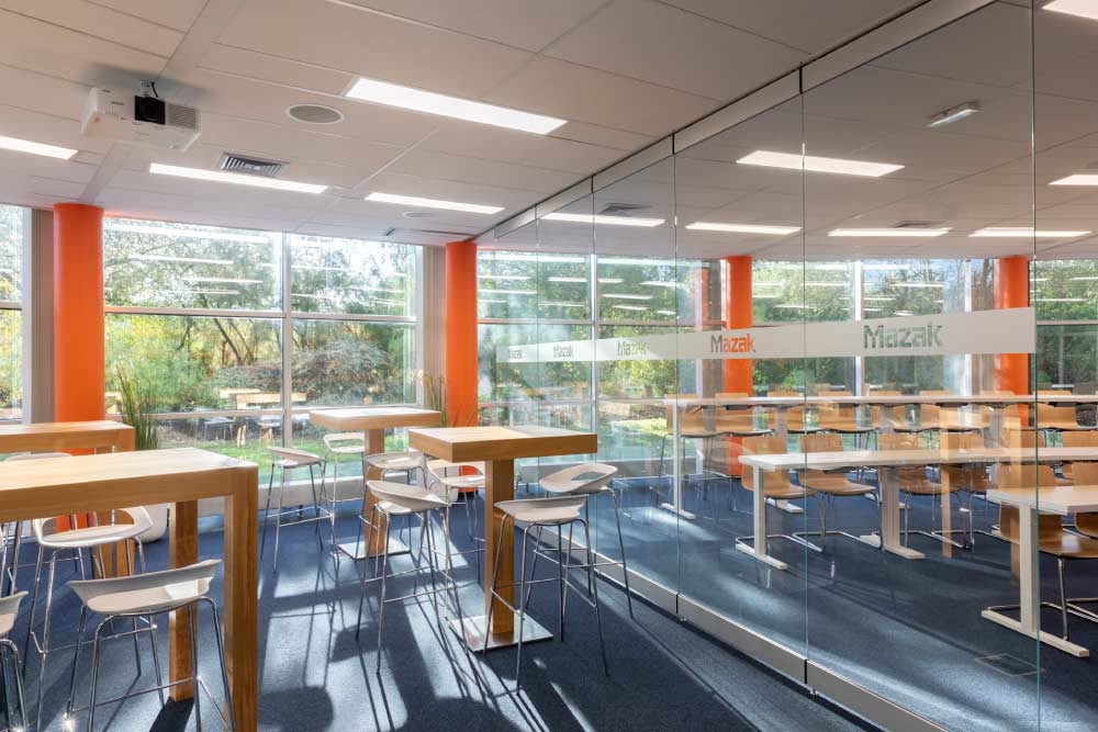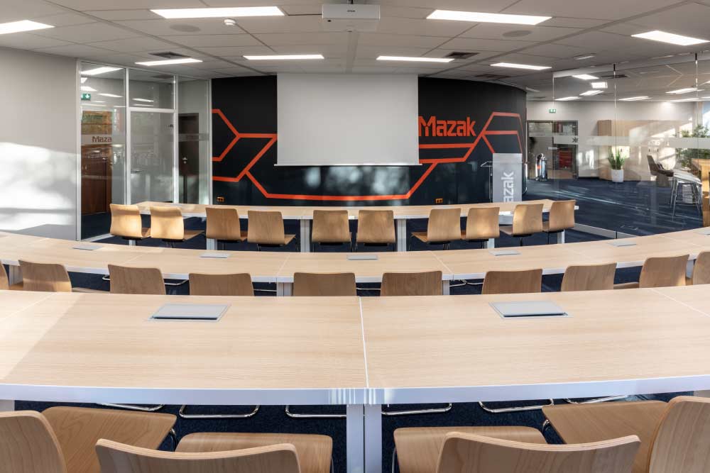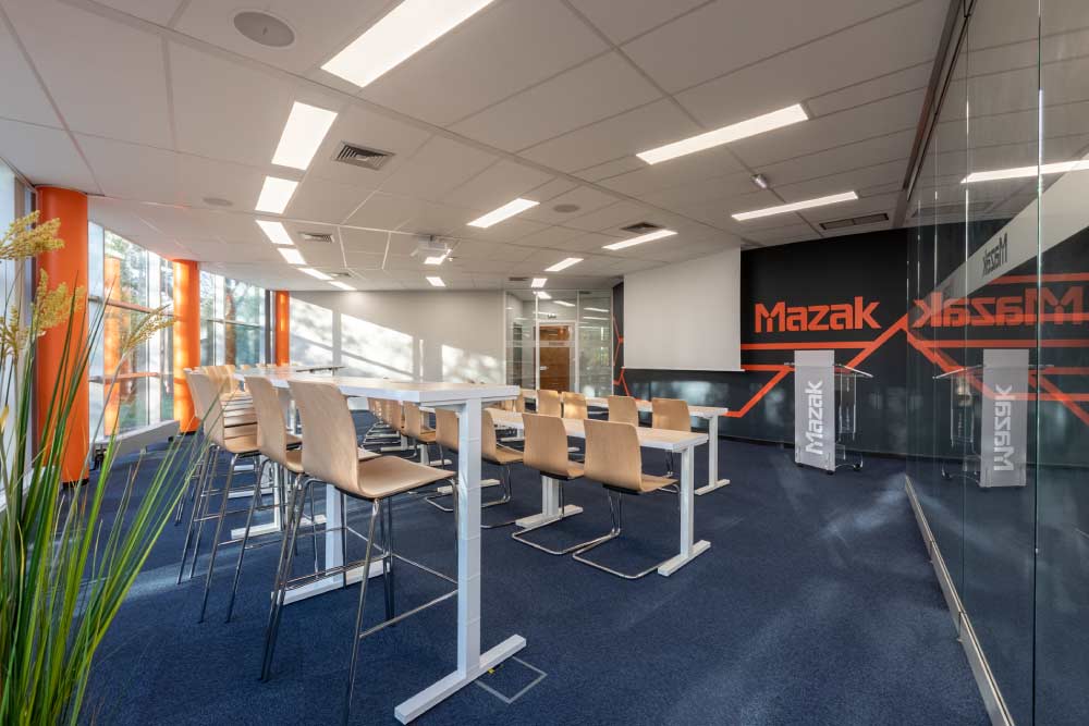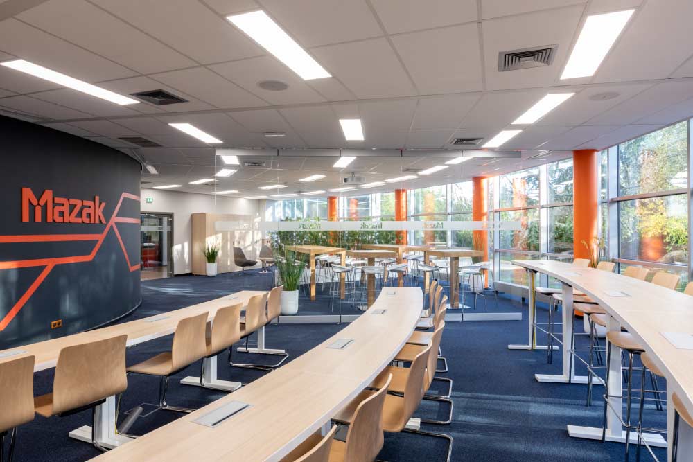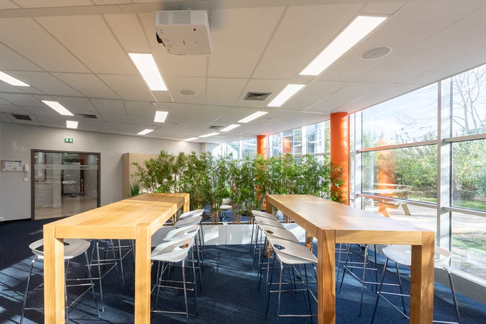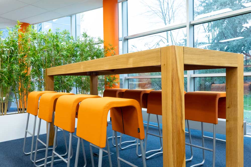 Découvrez notre galerie photos de l’agencement des locaux de Mazak avec l’installation de poste de travail, table de réunion sur mesure, table de restauration avec tabouret haut et décoration florale. Crédits photos Alain Delange.